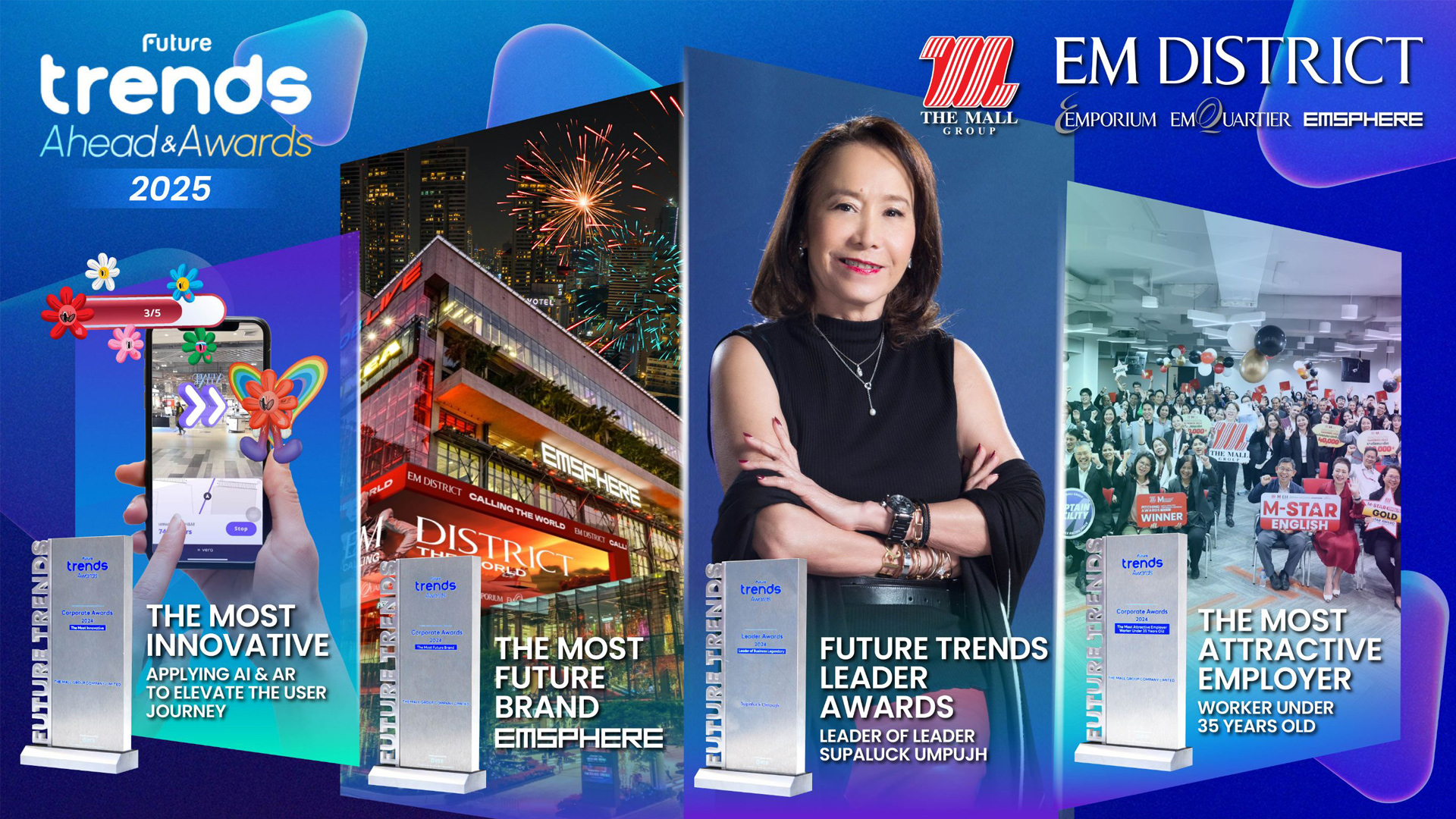 ภายในงาน Future Trends Awards 2025 ซึ่งเป็นการมอบรางวัลให้แก่องค์กร และบุคคลที่เป็นสุดยอดผู้นำเทรนด์ในการขับเคลื่อนอนาคตและเศรษฐกิจของประเทศไทย กลุ่มเดอะมอลล์ ผู้บริหารธุรกิจรีเทลชั้นนำ ของประเทศและระดับสากล ได้รับ 4 รางวัล ทั้งในระดับองค์กรและบุคคลผู้ทรงคุณวุฒิ