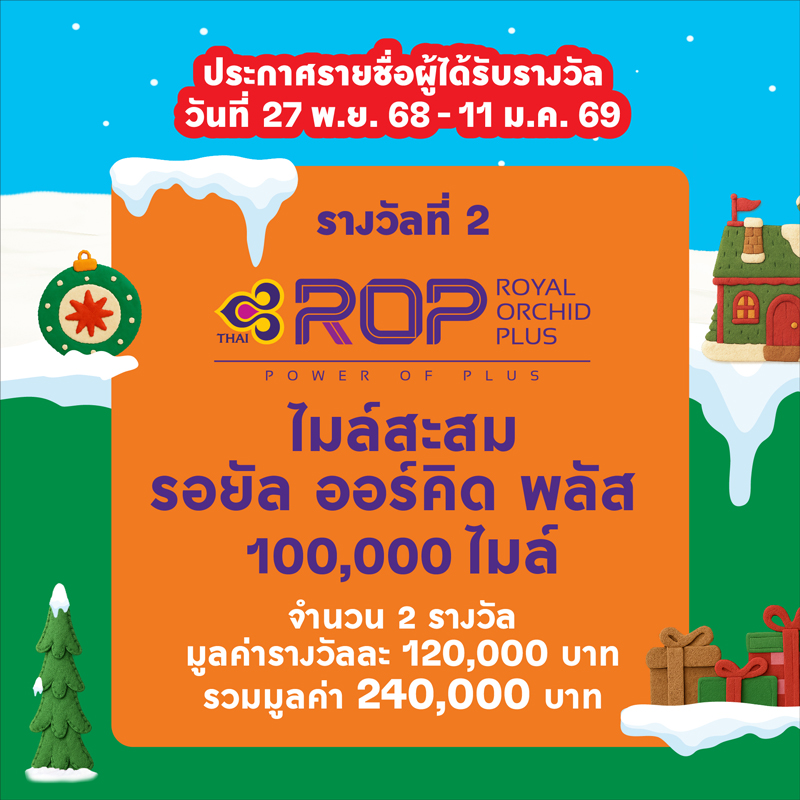 รางวัลที่ 2 ไมล์สะสมรอยัล ออร์คิด พลัส 100,000 ไมล์ จำนวน 2 รางวัล รางวัลละ 120,000 บาท รวมมูลค่า 240,000 บาท