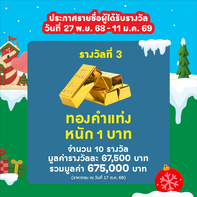 รางวัลที่ 3 ทองคำแท่ง หนัก 1 บาท จำนวน 10 รางวัล รางวัลละ 67,500 บาท รวมมูลค่า 675,000 บาท (ราคาทองคำ ณ วันที่ 17 ต.ค. 68)