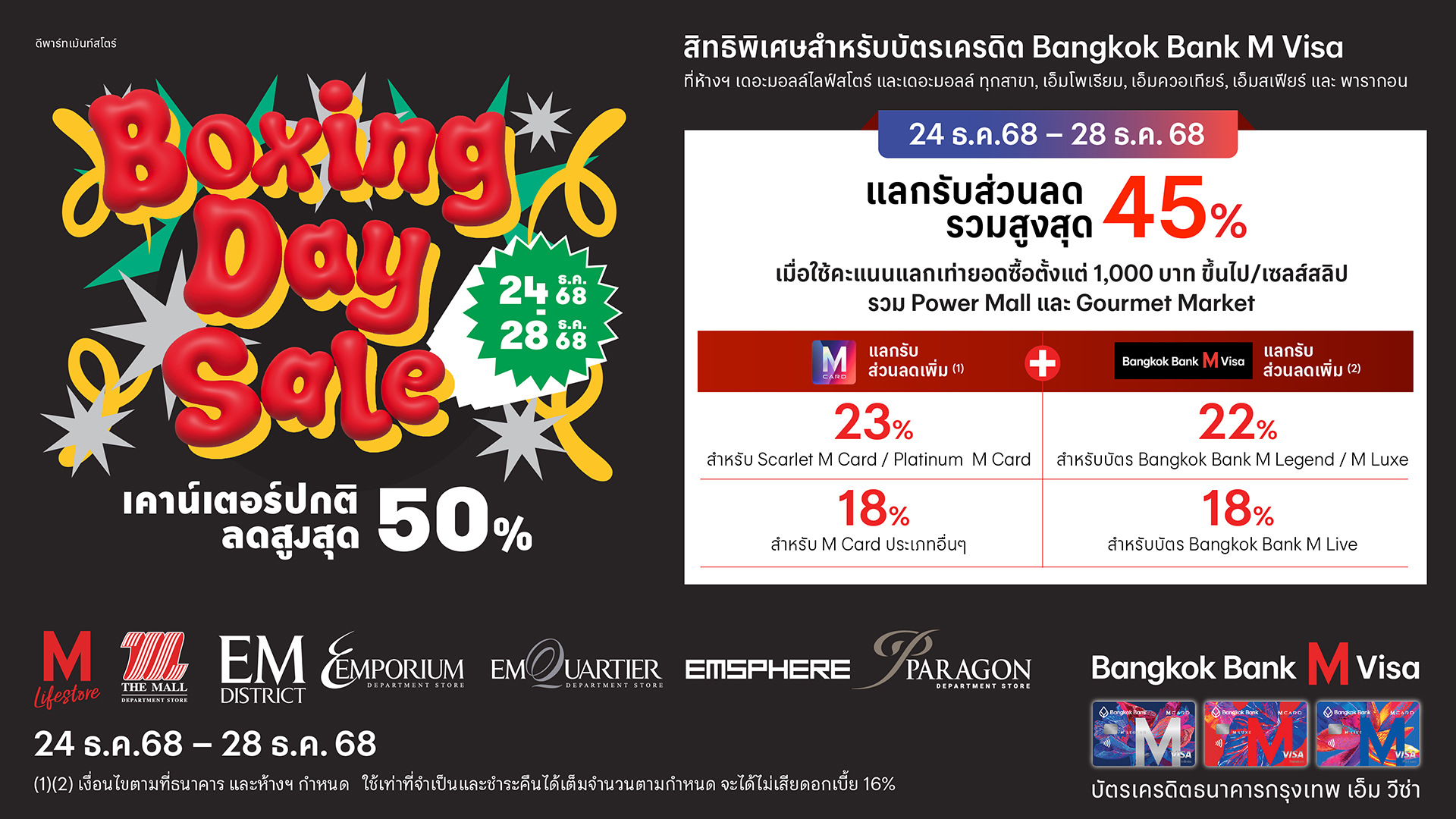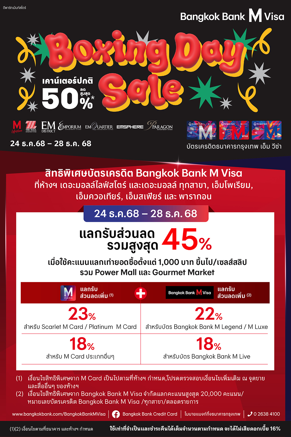 - ธนาคารและบริษัท เดอะมอลล์ กรุ๊ป จำกัด มีสิทธิในการเปลี่ยนแปลง และ/หรือยกเลิกกติกา เงื่อนไข ข้อกำหนด ระยะเวลา สิทธิประโยชน์ต่าง ๆ และ/หรือรายการส่งเสริมการขายนี้ได้ โดยจะแจ้งให้ทราบล่วงหน้าอย่างน้อย 7 วัน ก่อนการมีผลใช้บังคับ กรณีมีข้อสงสัย โปรดตรวจสอบกับธนาคาร และ/หรือ บริษัทเดอะมอลล์ กรุ๊ป