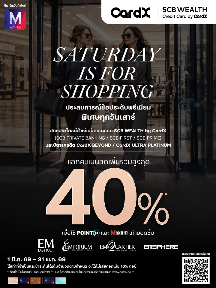 – สิทธิประโยชน์สำหรับสมาชิก M Card เมื่อใช้จ่ายแบบชำระเต็มจำนวนและชำระผ่านบัตรเครดิต CardX, CardX Beyond, CardX Ultra Platinum และกลุ่มบัตร SCB WEALTH Credit Card by CardX ได้แก่ SCB PRIVATE BANKING, SCB FIRST, SCB PRIME ที่ห้างสรรพสินค้าเดอะมอลล์ไลฟ์สโตร์ และเดอะมอลล์ ทุกสาขา, เอ็มโพเรียม, เอ็มควอเทียร์, เอ็มสเฟียร์ และ พารากอน (รวมยอดใช้จ่ายที่พาวเวอร์ มอลล์ และ กูร์เมต์ มาร์เก็ต) ทุกวันเสาร์ ระหว่างวันที่ 1 มีนาคม 2569 – 31 พฤษภาคม 2569 และใช้คะแนน M Point จากบัตร M Card เท่ายอดซื้อ แลกรับส่วนลดเพิ่มดังนี้