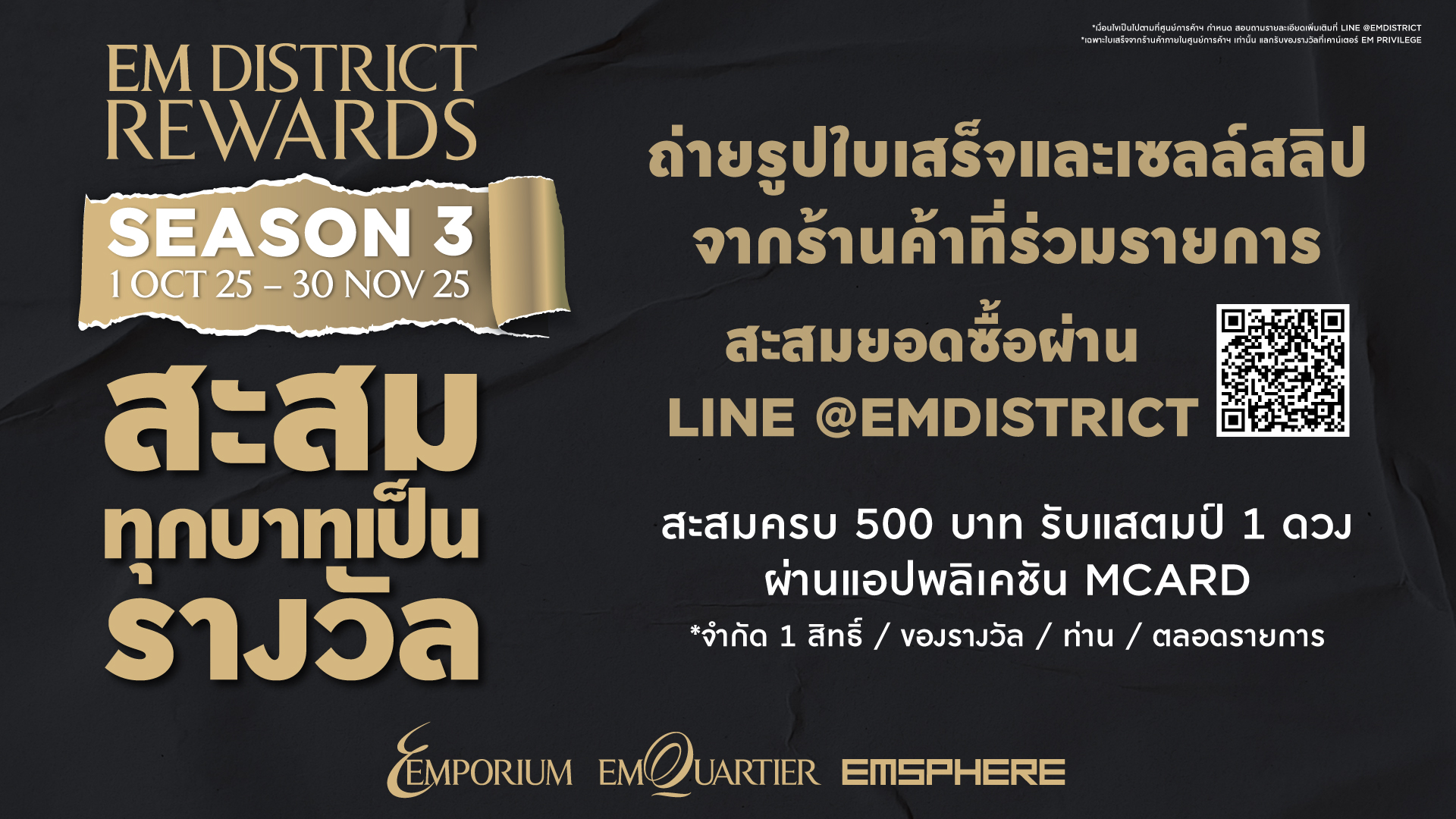 - การสะสมยอดช้อปในรายการ EM DISTRICT REWARD เป็นการสะสมเพื่อแลกรับของสมนาคุณเท่านั้น ไม่สามารถแลกรับเป็นคะแนน MCARD ได้