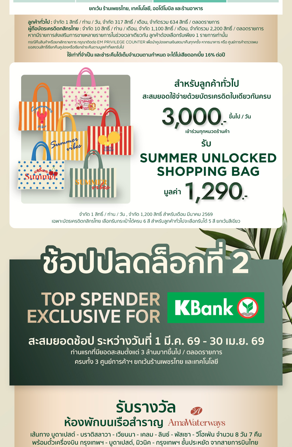 - การแลกกระเป๋า SUMMER UNLOCKED สามารถสะสมใบเสร็จได้ทุกศูนย์การค้าฯ รวมกันได้ทั้งช้อป และทานอาหาร จะต้องเป็นใบเสร็จภายในวันเดียวกัน, เซลล์สลิป และใบเสร็จที่สามารถแลกรับโปรโมชันได้ ต้องเป็นการชำระด้วยบัตรเครดิตผ่านเครื่อง EDC และเป็นบัตรเครดิตใบเดียวกันเท่านั้น โดยจำกัด 1 สิทธิ์ / ท่าน / วัน, จำกัด 1,200 สิทธิ์ สำหรับเดือน มีนาคม 2569