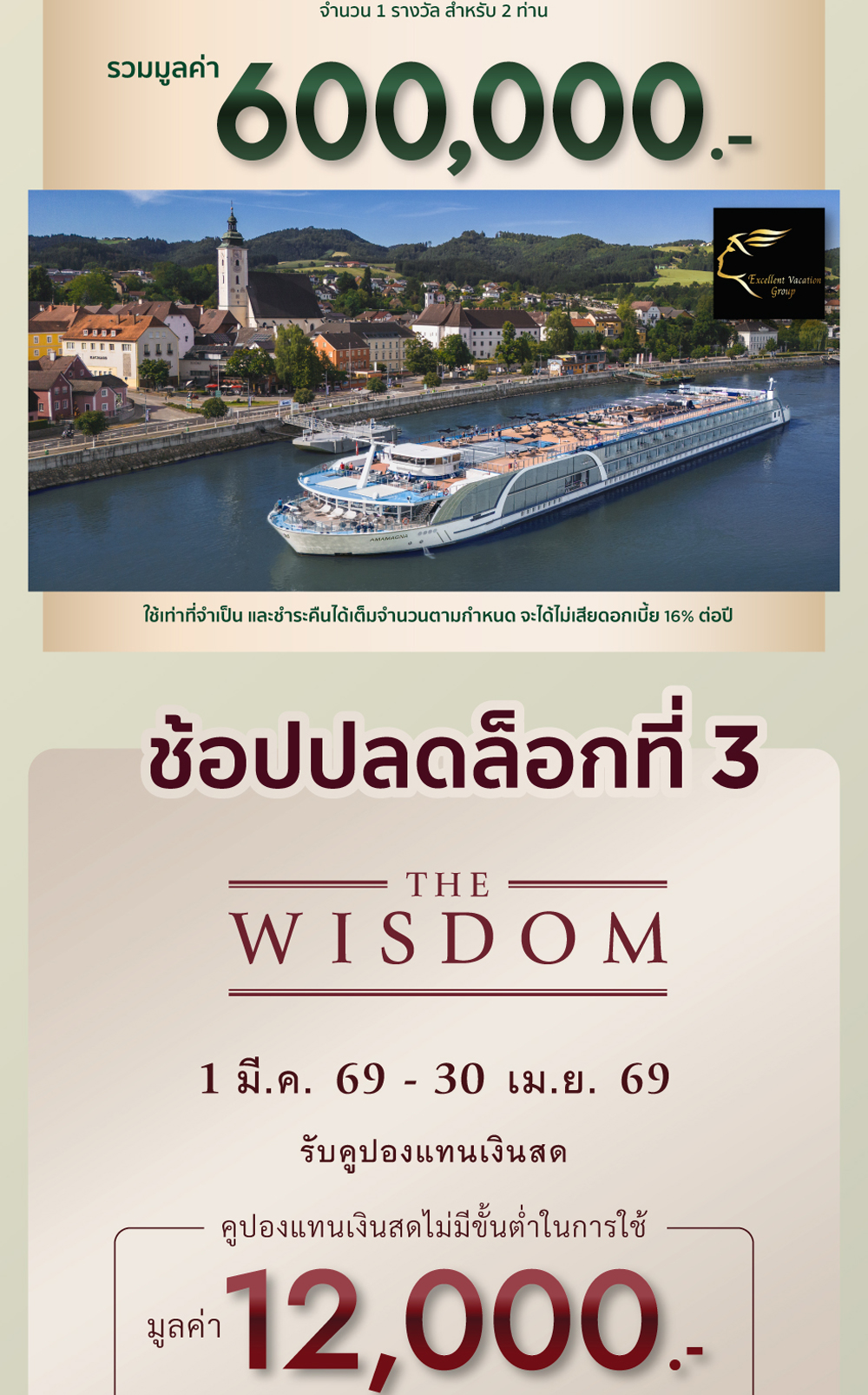 - เมื่อสะสมยอดใช้จ่ายขั้นต่ำ 3,000,000 ขึ้นไป 1 ท่านแรกที่มียอดสูงสุดตลอดรายการ รับรางวัล ห้องพักบนเรือสำราญ AMAWATER WAYS เส้นทาง BUDAPEST – BRATISLAVA – VIENNA – KREMS – LINZ – PASSAU – VILSHOFEN8 DAYS / 7 NIGHTS รวมตั๋วไป – กลับ ECONOMY CLASS กรุงเทพ – บูดาเปส, มิวนิค – กรุงเทพ จากสายการบิน THAI AIRWAYS รวม 1 รางวัล สำหรับ 2 ท่าน รวมมูลค่า 600,000.-