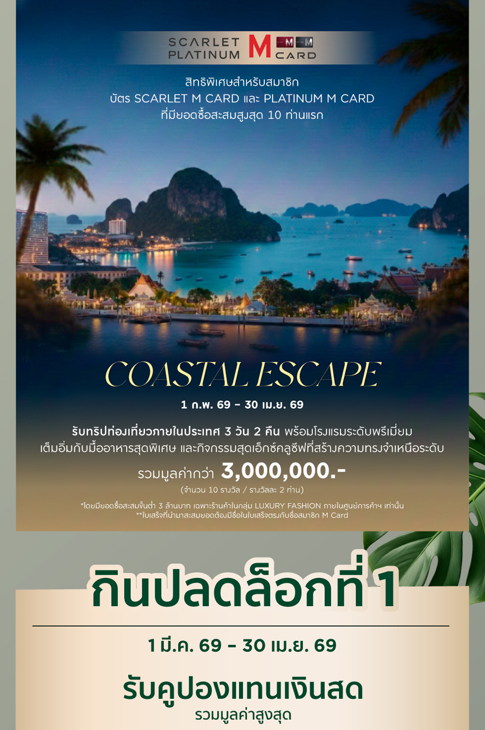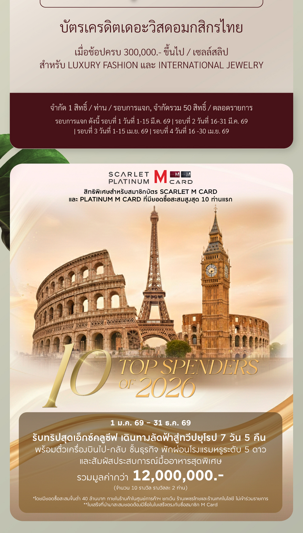 และชั้น G และ M เอ็มสเฟียร์ ภายในวันที่ใช้จ่ายเท่านั้น ตั้งแต่เวลา 00 น. – 22.00 น. เท่านั้น ไม่สามารถลงทะเบียนย้อนหลังได้ - เฉพาะใบเสร็จจากการใช้จ่ายจากร้านค้าภายในศูนย์การค้า เอ็มโพเรียม, เอ็มควอเทียร์ และเอ็มสเฟียร์ เท่านั้น ยกเว้น ห้างสรรพสินค้าทุกแผนก, สปอร์ต มอลล์, พาวเวอร์มอลล์, กูร์เมต์ มาร์เก็ต, กูร์เมต์ เทคโฮม, บิวตี้ ฮอลล์, ฟู้ด ฮอลล์, สินค้าแลกซื้อ, การซื้อคูปอง, บัตรเติมเงินทุกประเภท, เคาน์เตอร์เครื่องสำอางบริเวณชั้น G ศูนย์การค้าเอ็มโพเรียม, เอ็มควอเทียร์ และเคาน์เตอร์เครื่องสำอาง ชั้น M ศูนย์การค้าเอ็มสเฟียร์, ใบเสร็จจากการชำระสินค้าไม่เต็มจำนวน, ใบเสร็จจากการจองรถยนต์, การซื้อ GIFT CERTIFICATE, VOUCHER / CASH COUPON, การชำระค่าโทรศัพท์, การชำระค่าบัตรเครดิต, การชำระค่าประกัน ทุกประเภท, การชำระค่าสาธารณูปโภค (ค่าน้ำ, ค่าไฟ), การชำระค่าดอกเบี้ย / ค่าปรับ หรือค่าบริการต่าง ๆ , เครื่องดื่มแอลกอฮอล์, บุหรี่, การซื้อกองทุน LTF/RMF, การทำธุรกรรมต่าง ๆ ทางธนาคาร, ร้านทอง / การออกใบเสร็จที่ไม่มีระบุเลขประจำตัวผู้เสียภาษีอากร / บิลเงินสด /ค่าที่จอดรถใบส่งสินค้า, ใบส่งของ, ใบเสร็จหรือบิลเงินสดที่แนบนามบัตรร้านหรือเขียนหัวบิลด้วยลายมือ,ใบเสร็จที่ไม่ระบุวันที่ซื้อสินค้า, ใบเสร็จที่มีการแก้ไข ดัดแปลงข้อความหรือตัวเลข, ใบเสร็จที่มีการตัดส่วนหัวหรือส่วนท้ายใบเสร็จ, ใบเสร็จที่ระบุวันที่ซื้อสินค้าหรือบริการในวันที่ร้านค้า/สถาบันปิดให้บริการ, ใบเสร็จจากการจองสินค้าที่ยังไม่มีการจ่ายมัดจำจริงหรือการจ่ายมัดจำที่สามารถคืนเงินได้, ใบเสร็จจากการซื้อเพื่อการลงทุน เช่น การซื้อหน่วยลงทุน, การชำระค่าประกันชีวิตหรือค่ากรมธรรม์ทุกประเภท, ใบเสร็จ DEPOSIT ไม่สามารถร่วมรายการได้,ค่าอินเตอร์เน็ต, การซื้อหรือเติมเงินบัตรแทนเงินสดทุกประเภท, การแลกเปลี่ยนเงิน (EXCHANGE), การชำระค่าบริการผ่าน COUNTER SERVICE ไม่สามารถร่วมรายการได้