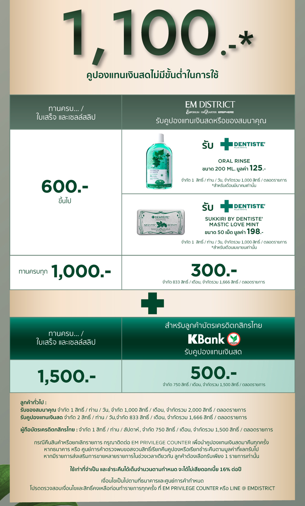 - กรณีคืนสินค้าหรือยกเลิกรายการ กรุณาติดต่อ EM PRIVILEGE COUNTER เพื่อนำคูปองแทนเงินสดมาคืนทุกครั้ง หากธนาคาร หรือ ศูนย์การค้าตรวจพบขอสงวนสิทธิ์เรียกคืนคูปองหรือเรียกชำระคืนตามมูลค่าที่แลกรับไป